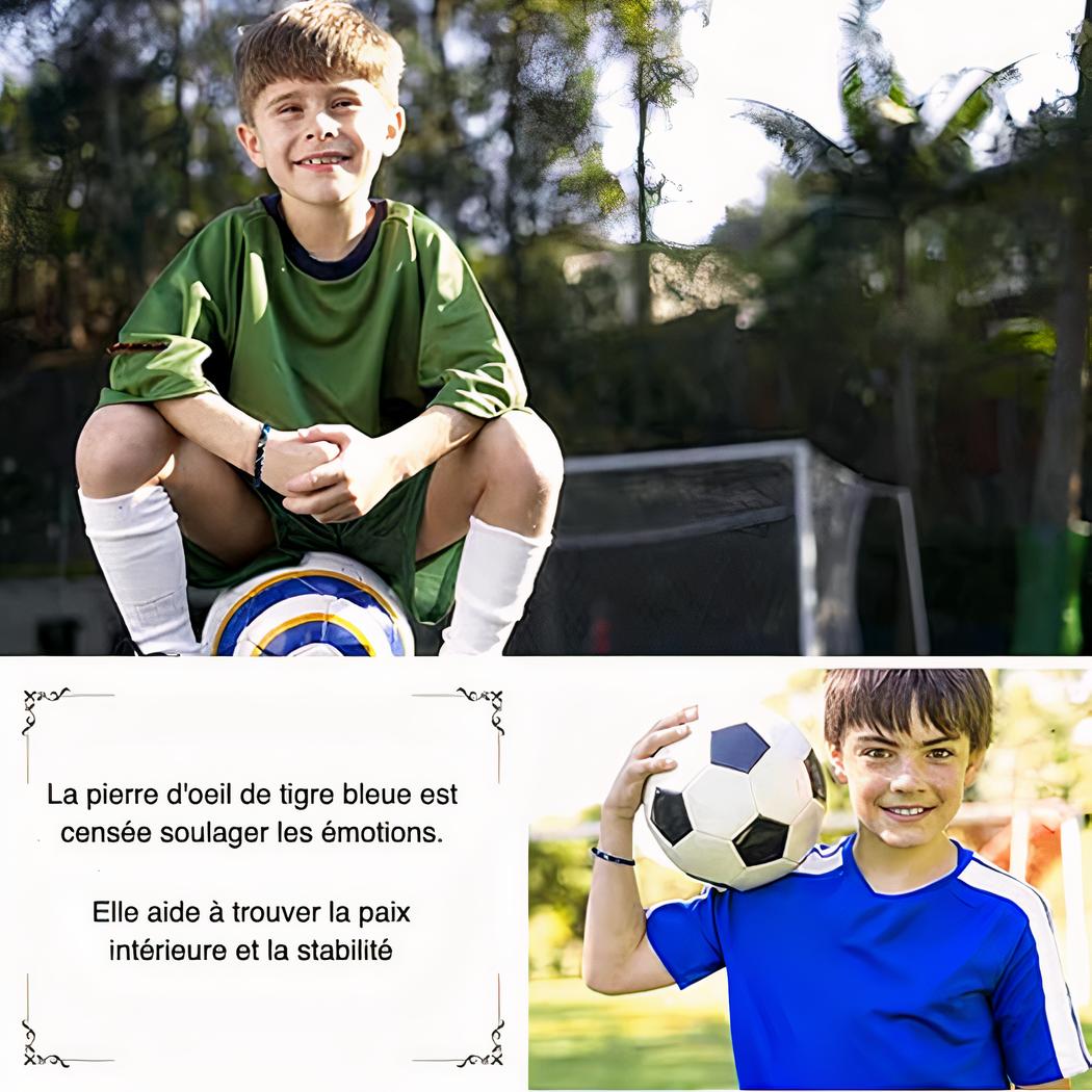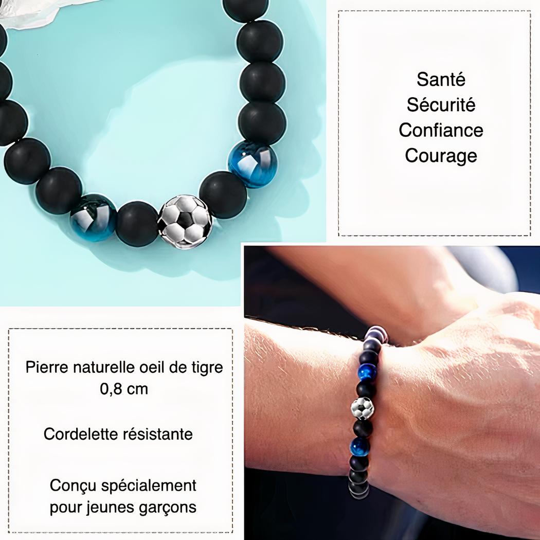 Les perles qui composent ce petit bijou pour jeunes garçons sont en pierres naturelles noires et deux en oeil de tigre bleu, connu pour ses propriétés bénéfiques. Cette pierre naturelle et fascinante a de nombreuses vertus notamment de guérison. La perle médiane représente un ballon de football, ce qui fera de ce bracelet un cadeau particulièrement apprécié des amateurs de ce sport.