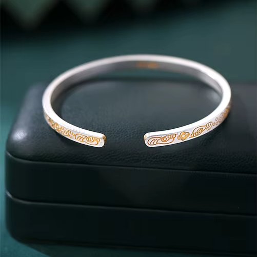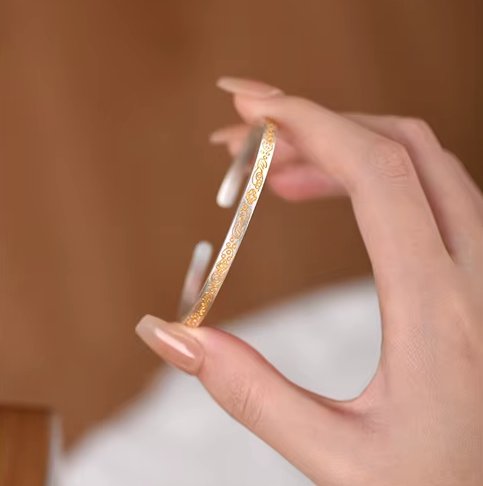 Ce bracelet jonc motif floral en argent plaqué or sera un accessoire adapté à votre vie quotidienne. Que vous souhaitiez le porter ponctuellement ou tous les jours, cet accessoire sublimera n'importe quelle tenue avec élégance et sophistication. Il ne craindra pas l'humidité et sera facile à conserver comme neuf. Veillez simplement à l'enlever pour faire du sport.