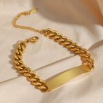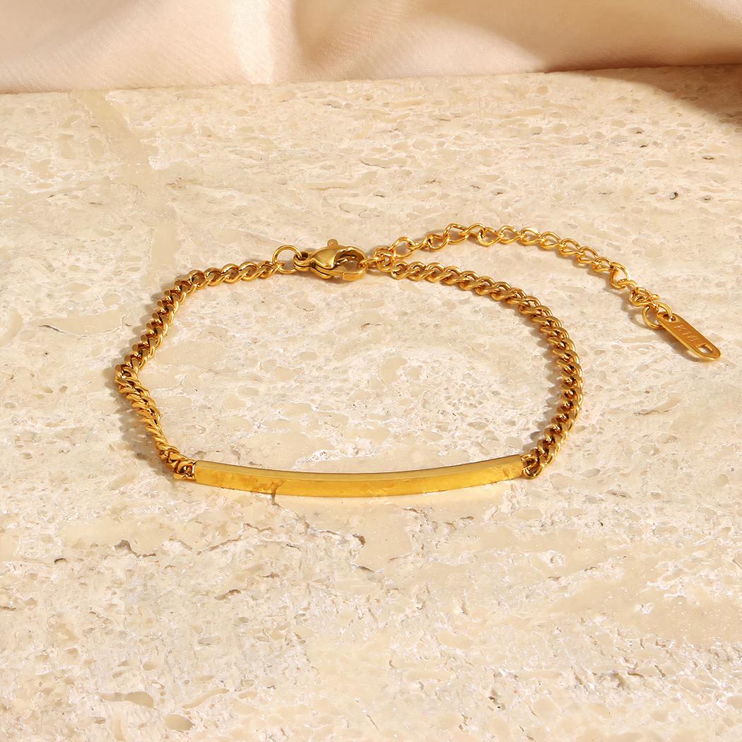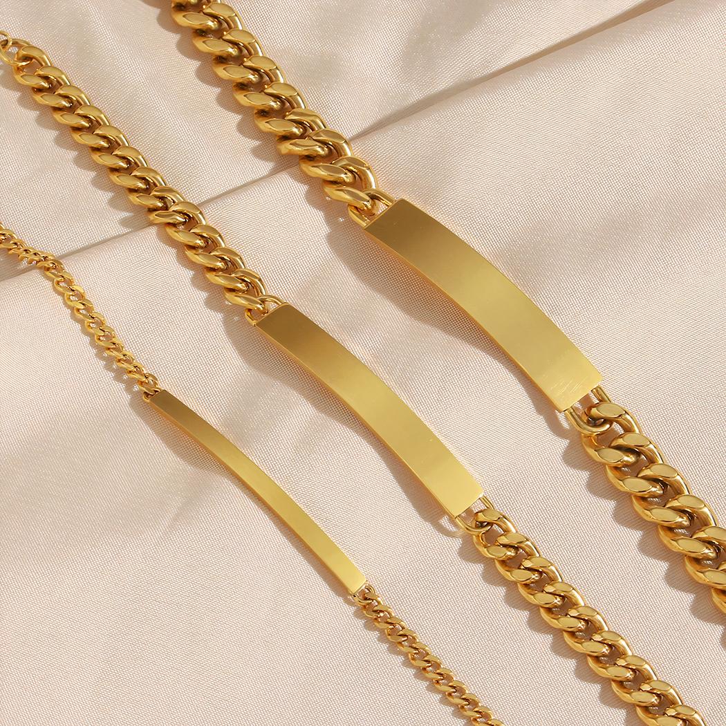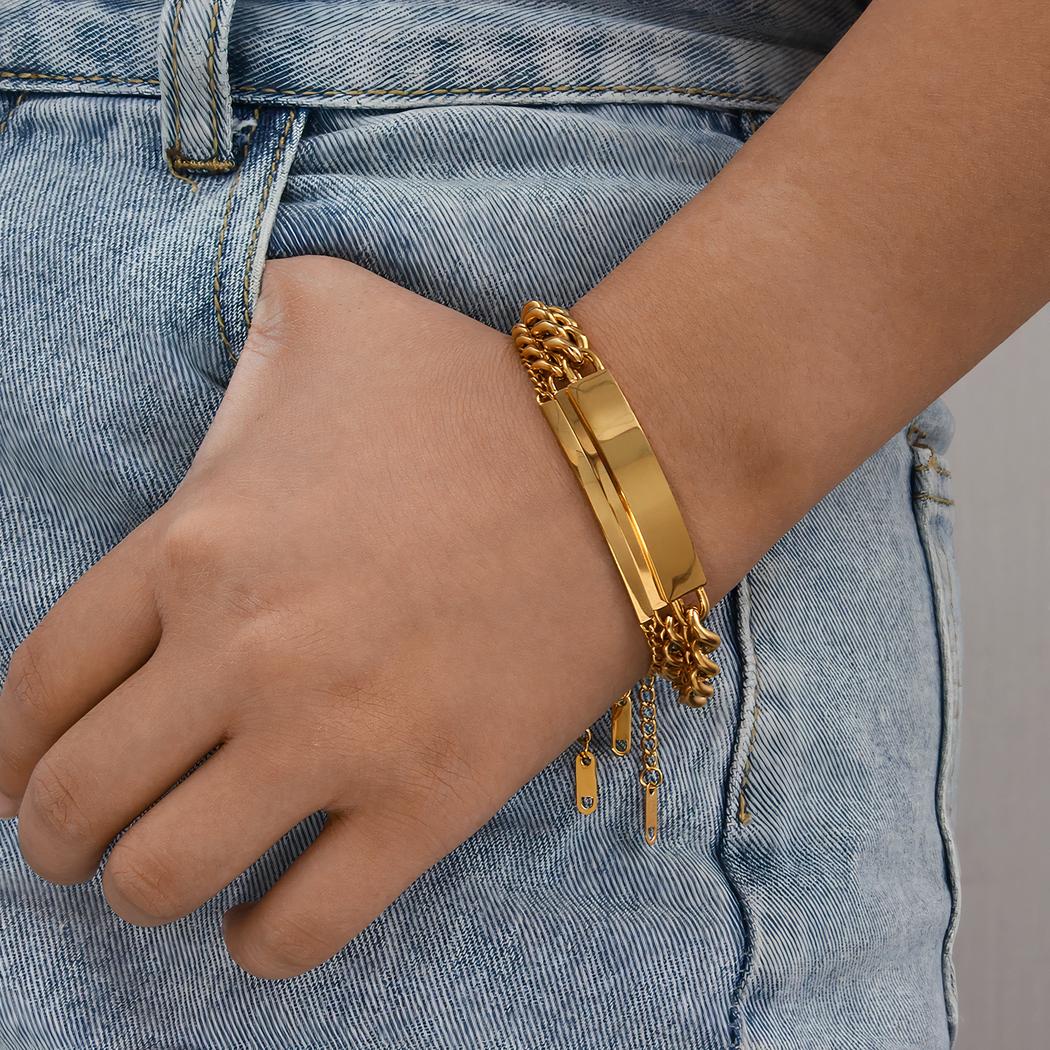 Ce bracelet gourmette est fabriqué à partir d'acier inoxydable, inaltérable, résistant à la corrosion donc à la rouille entre autres. De plus, il est traité par un procédé permettant de projeter de l'or dessus à haute température, ce qui le rend encore plus solide : le poinçon est visible sur l'extension de fermeture.