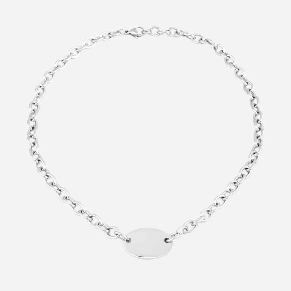 Ce bracelet gourmette est conçu avec un design très original, et par ses maillons et par sa plaque d'identité. Les maillons rolo ont un effet rond tournant qui donne une allure décontractée. La plaque elle, de forme ovale de plus de deux centimètres, apporte son look minimaliste et sobre, qui convient parfaitement à ce bijou féminin.