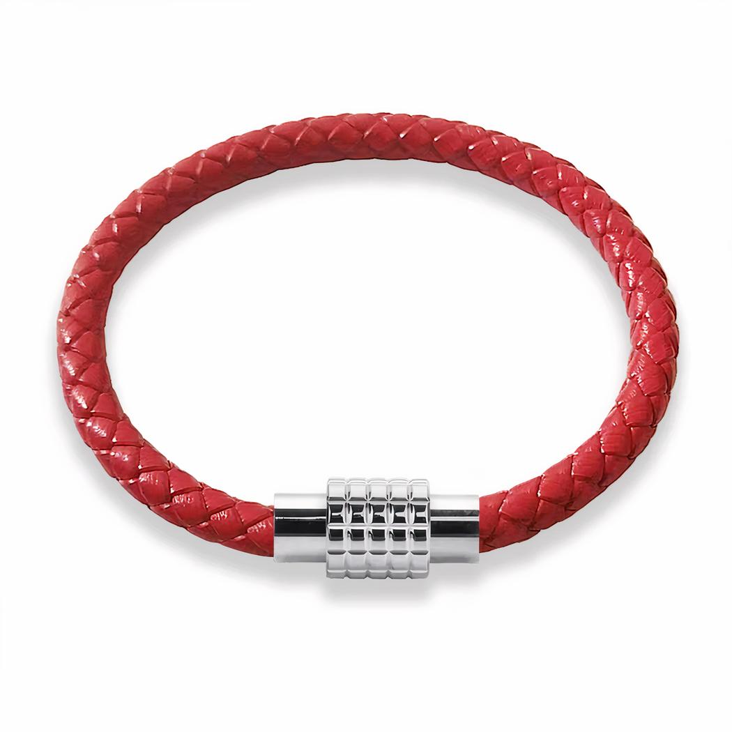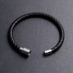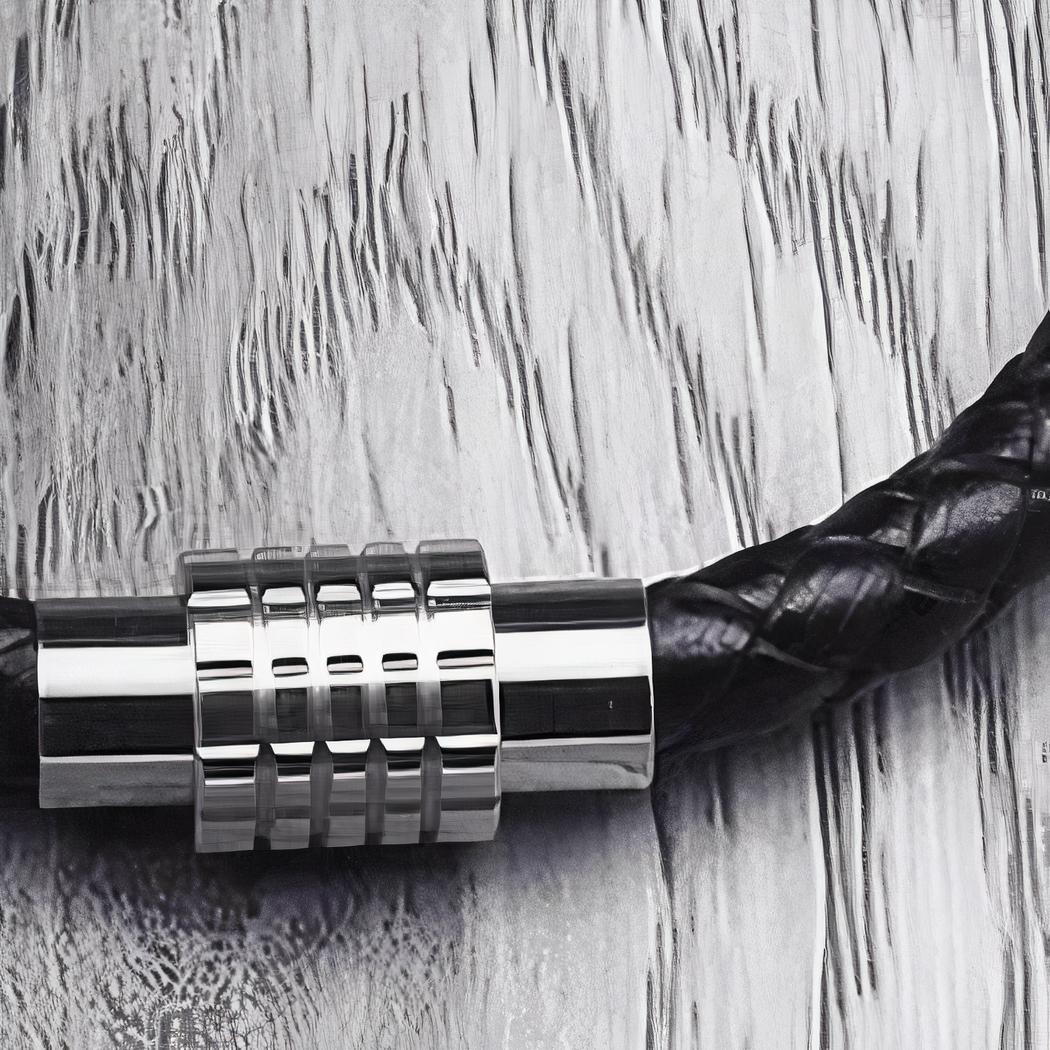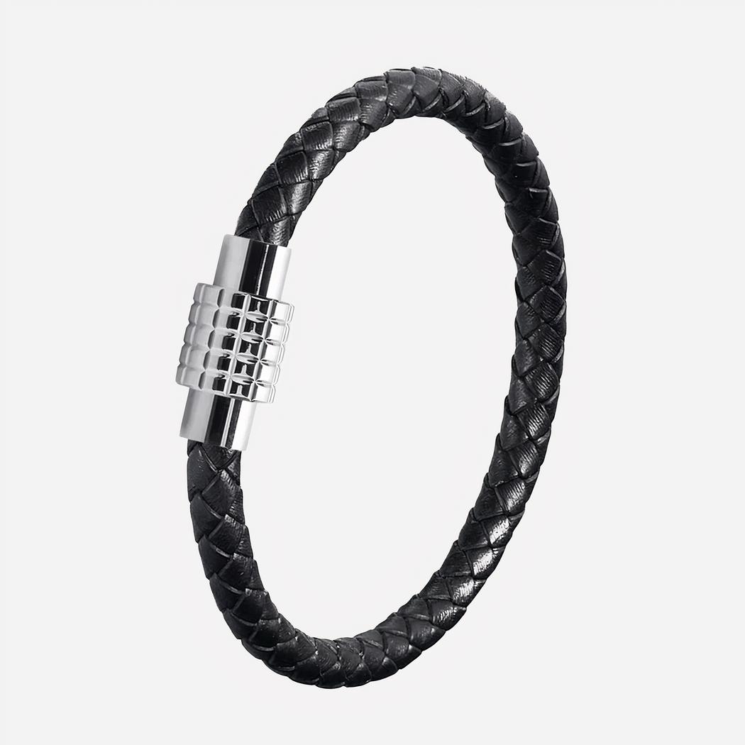Le design unique du bracelet combine le côté classique du cuir véritable avec la modernité du fermoir magnétique en acier inoxydable, offrant une touche d'élégance à toute tenue. Le contraste entre le noir profond du cuir et les accents argentés du fermoir crée un effet visuel saisissant qui ne passera pas inaperçu.