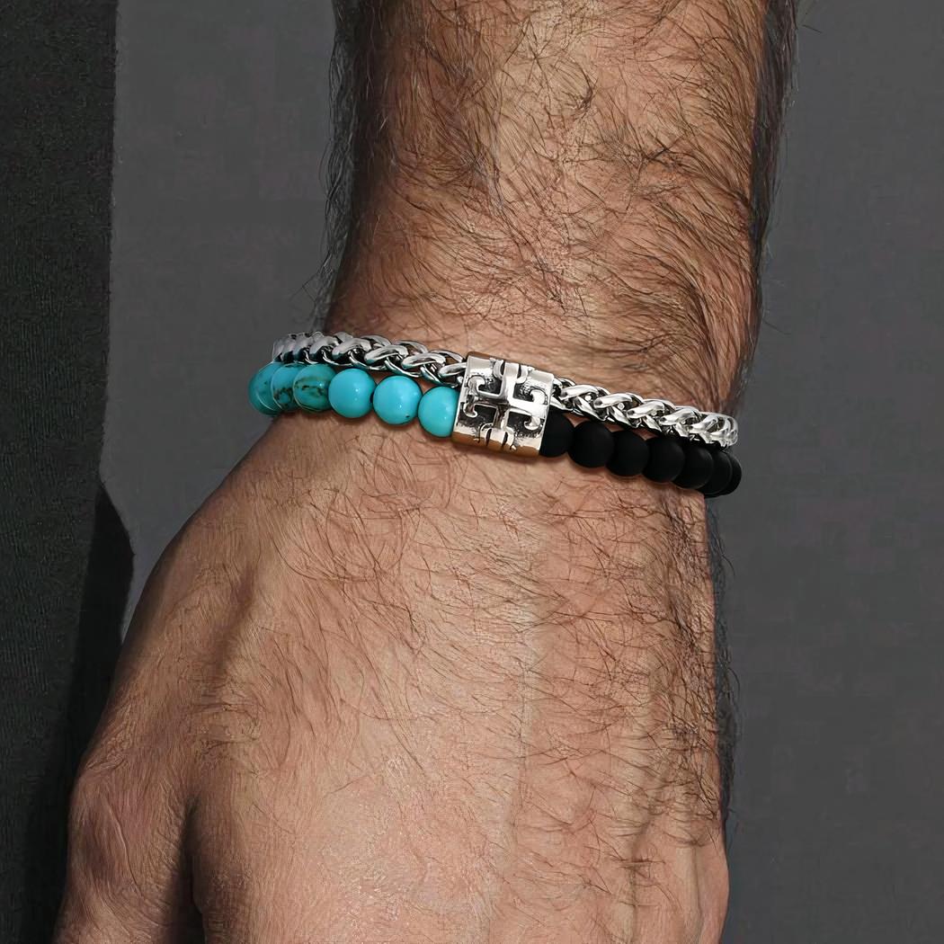 Ce bracelet multi couche possède un look très masculin élégant et décontracté à la fois. Il mêle la turquoise et la cornaline noire pour un contraste au visuel saisissant : on croirait être en été avec ce bracelet. Il est facile à porter, confortable et possède une chaînette d'ajustement. Le fermoir de style homard est sécurisant.