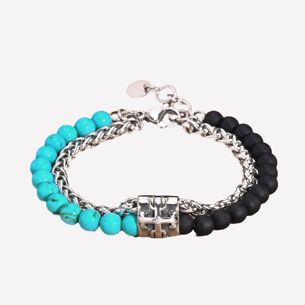 Ce bracelet homme perles et acier est un bracelet double couche en perles de pierres naturelles et acier inoxydable relié par un cabochon orné d’une croix. Vous aurez le contraste de l'élégance et le décontracté en même temps, la finesse et un look stylé très tendance avec ce bijou.