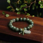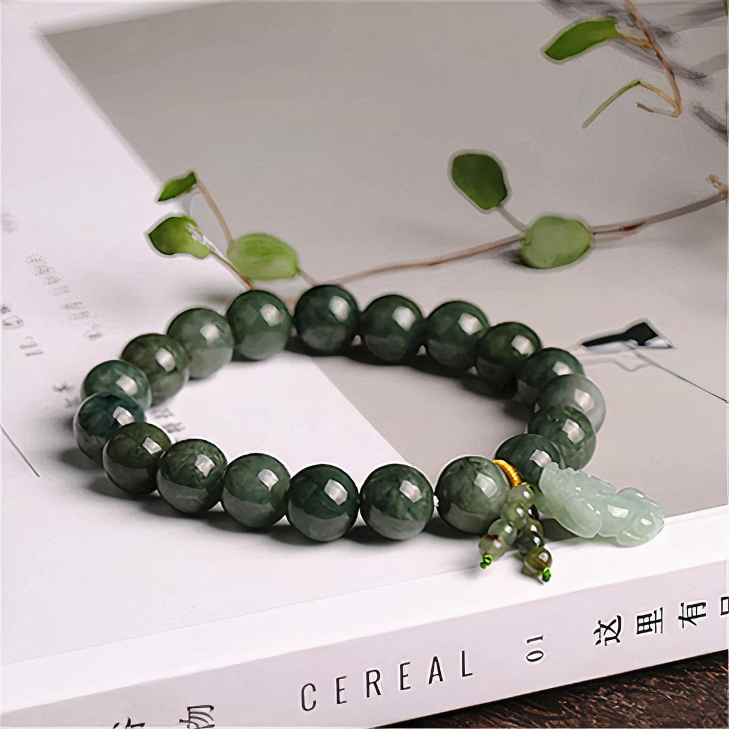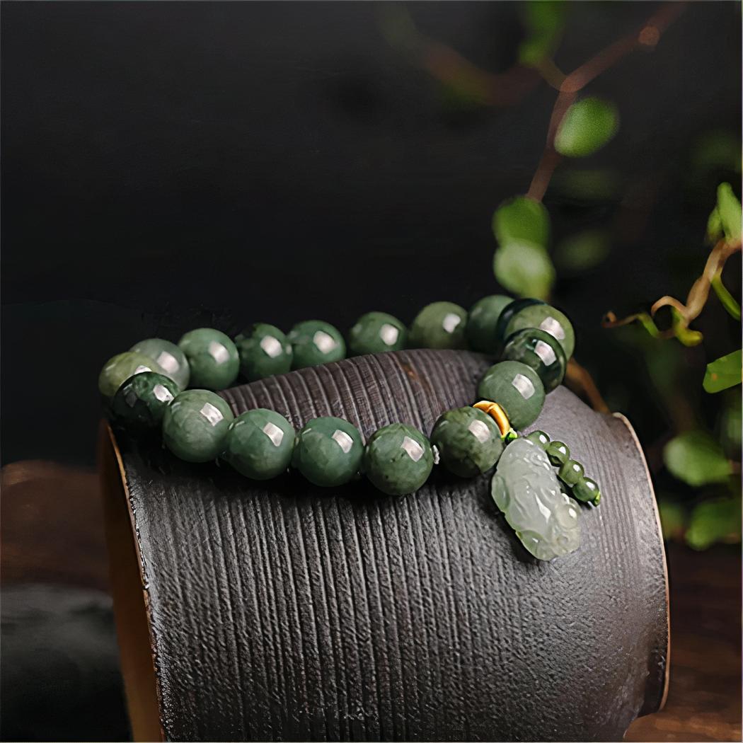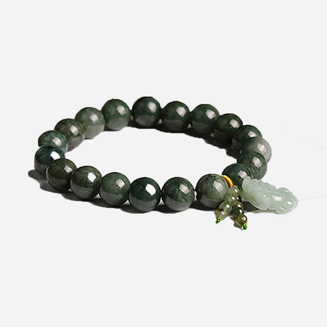Pixiu, créature mythologique, neuvième fils du Roi Dragon, est le pendentif porte-bonheur de ce bracelet de jade, pierre gemme dure et tenace très employée en joaillerie. Cependant Pixiu ne doit pas être porté par les natifs des années Chien, Lapin et Tigre, incompatibles avec le Dragon. Le jade donne de la tempérance et améliore la tolérance envers soi-même et les autres : elle favorise les relations saines, harmonieuses et authentiques.
