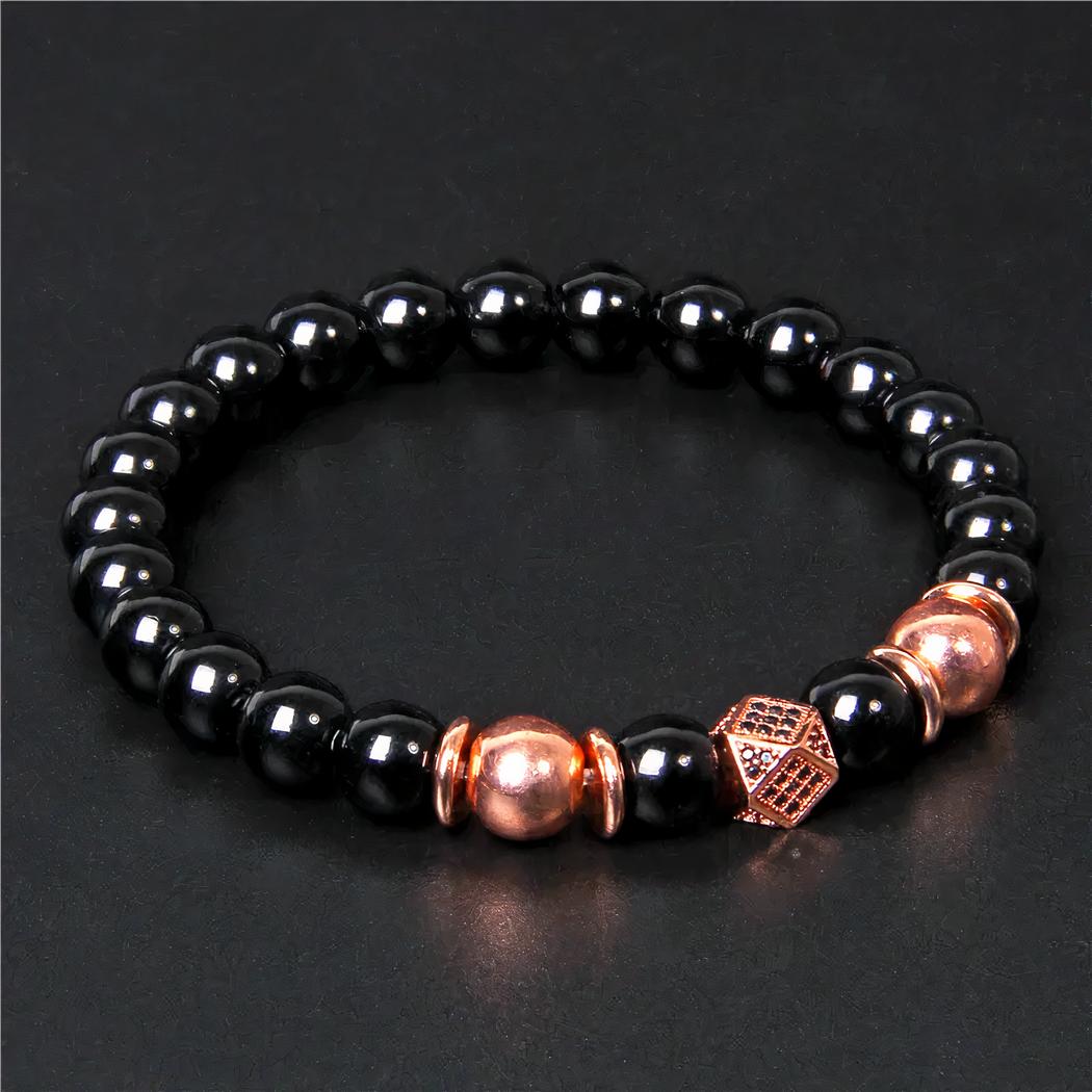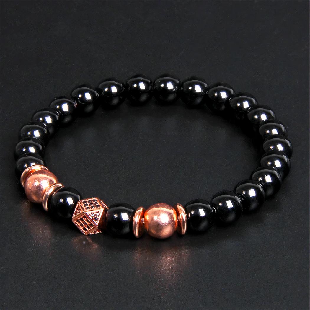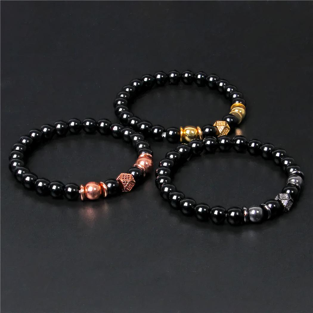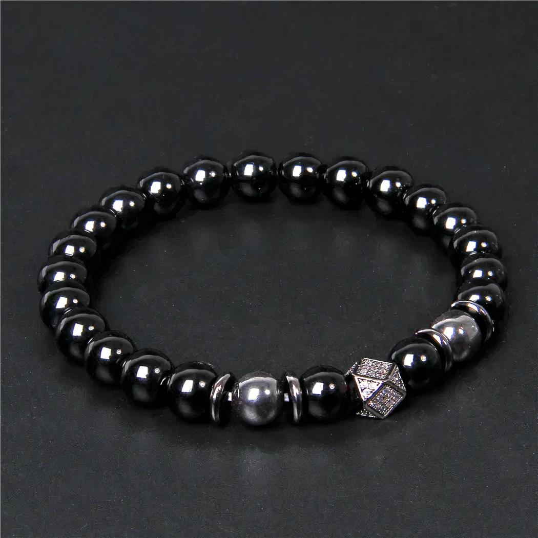 Les perles de ce bracelet sont en onyx noir : cette pierre a des propriétés psychiques utilisées en lithothérapie pour par exemple harmoniser le corps et l'esprit et travaille les énergies positives. De plus, elles sont parfaitement adaptées pour fabriquer des bijoux avec leur couleur brillante si attirante. Ce bracelet est élégant et trouvera sa place dans toutes les collections de bijoux masculins.